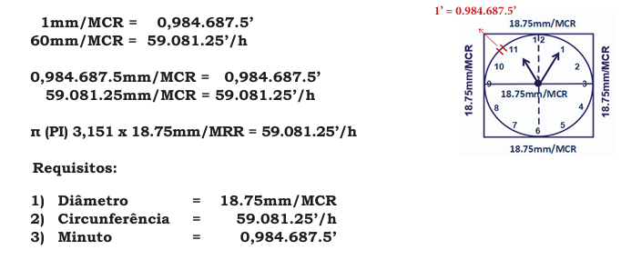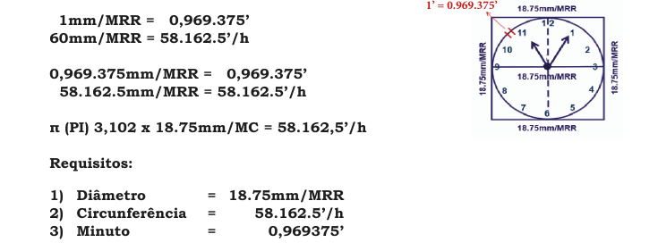 3 – Fabricar o Relógio Padrão, com a minha autorização, com 18.75mm/MR (dezoito vírgula setenta e cinco milímetros) de Diâmetro, conseqüentemente, a Circunferência será Sessenta Minutos, (60’), estabelecendo a RELAÇÃO ESPAÇO/TEMPO, “Minuto Equivalente a Milímetro”.