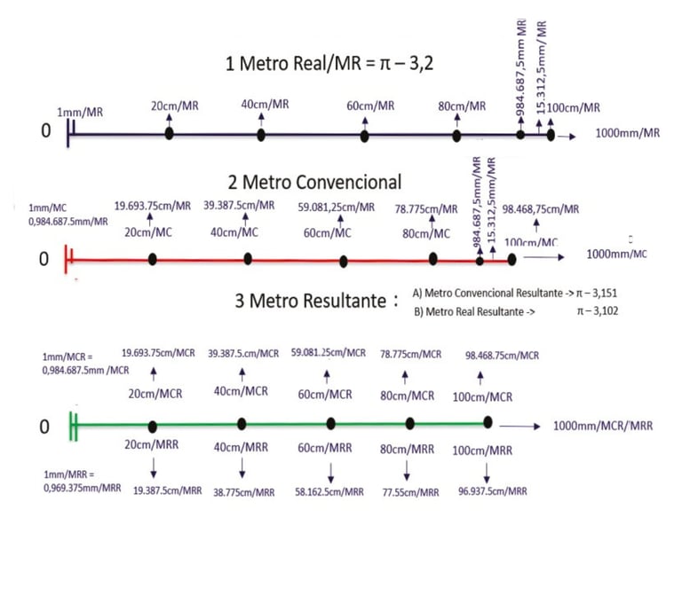 4ª) O π (PI) 3,14 (Três vírgula quatorze), Metro Real Resultante/MRR, corresponde ao π (PI) 3,168 (Três virgula cento e sessenta e oito), Metro Convencional Resultante/MCR;
