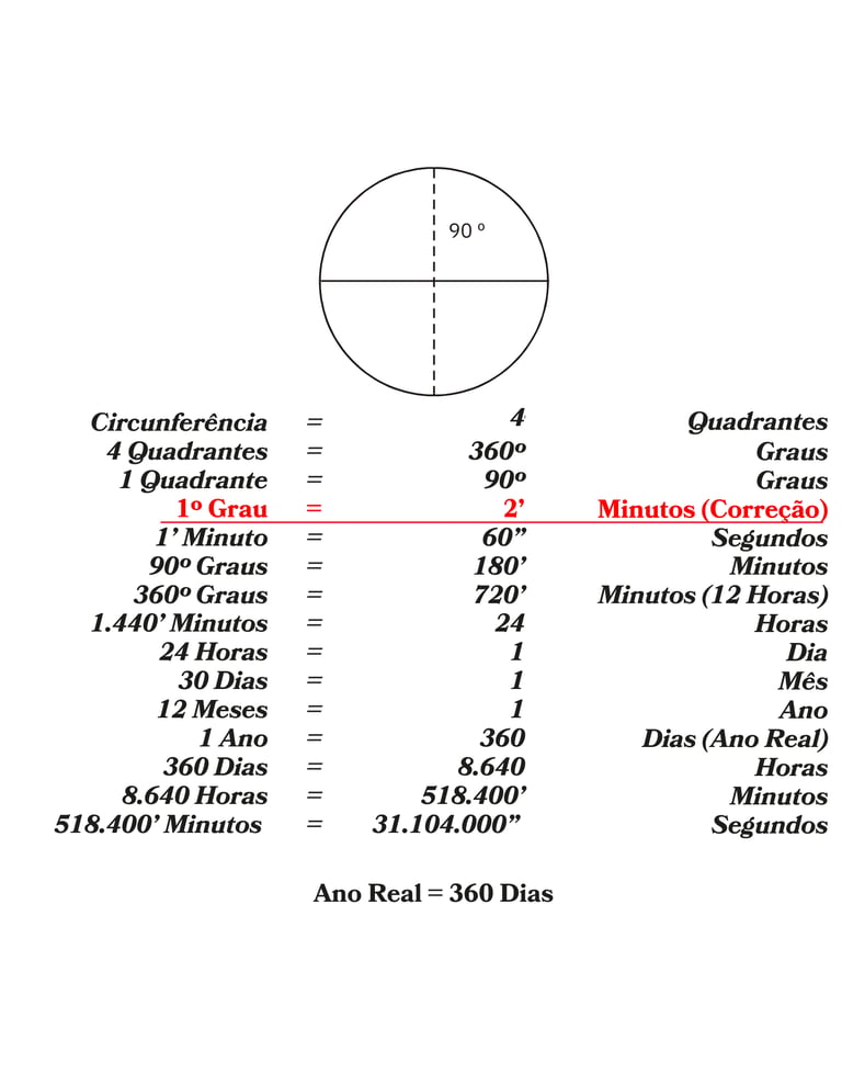 Devido a correção do Grau, efetuada na Divisão Sexagesimal da Circunferência, reduzindo o valor do Grau de 60 minutos (60’) para 2 minutos (2’), determinamos, conforme os dados e Cálculos processados, o Ano Real em 360 dias distribuídos, também, em 12 meses, porém, todos os meses com 30 dias, todos os dias com 24 horas, todas as horas com 60 minutos (60’) e todos os minutos com 60 segundos (60”).